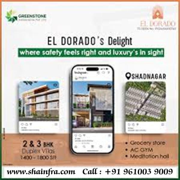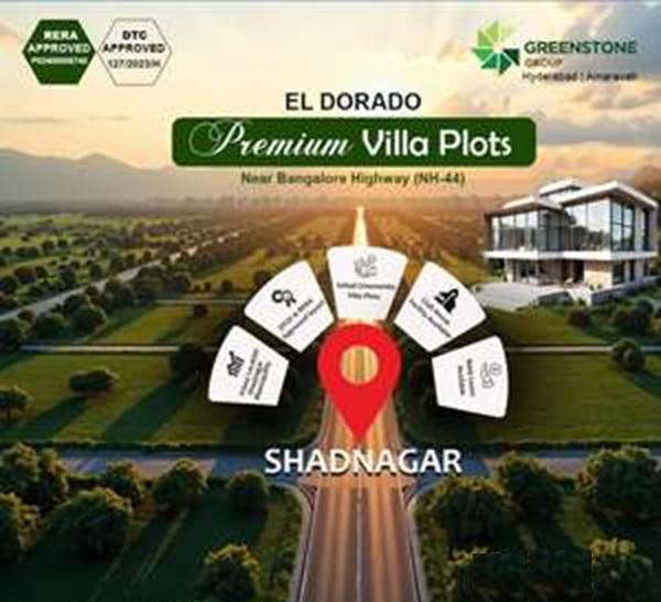 El Dorado villas and plots are located in Shadnagar, Hyderabad, near the Bangalore Highway (NH-44), offering 2, 3 BHK villas and DTCP/RERA-approved plots with amenities like clubhouses, gyms, and pools, with prices starting from the mid-Lakhs to Crores depending on villa size or plot area (e.g., 1400-3887 sq ft for villas, 165-404 sq yards for plots).